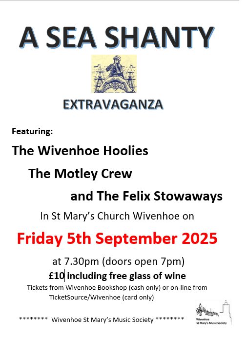 – Sea Shanty Extravaganza with The Wivenhoe Hoolies, The Felix Stowaways and the Motley Crew from Brightlingsea. An evening of shanties from these three accomplished crews culminating in a grand finale. A great fun evening.
